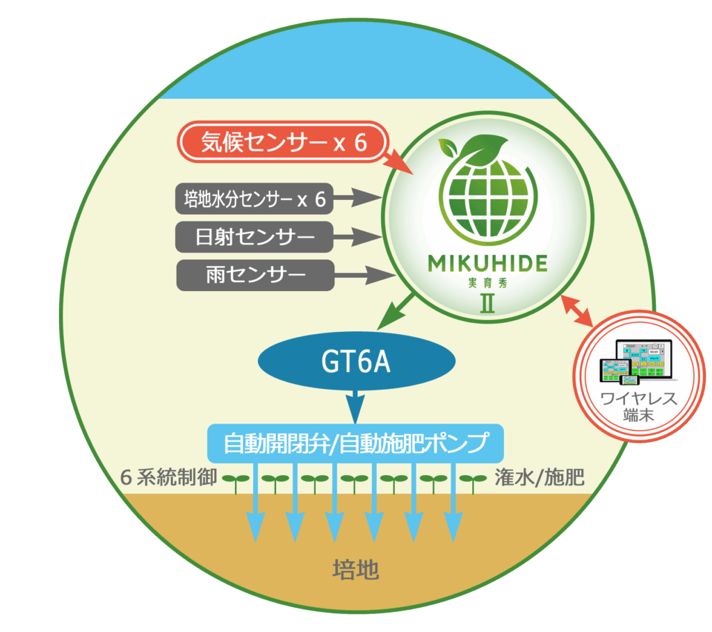 気象条件によって潅水のタイミング、施肥濃度を自動的に算出し、最適な潅水と施肥をおこないます。GT6Aやテレグローリーなどのシステムと組み合わせて各設備のシステム構築が可能です。